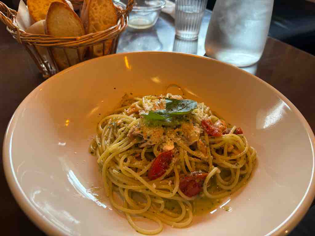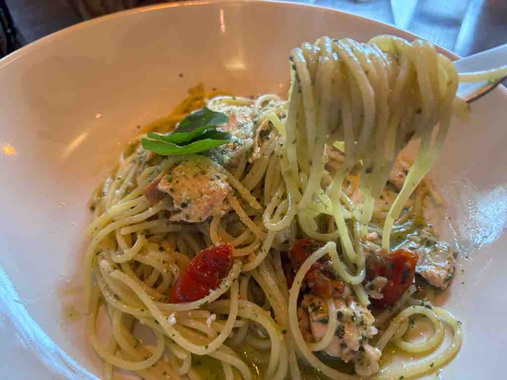 本日のパスタは、サーモンとバジル。